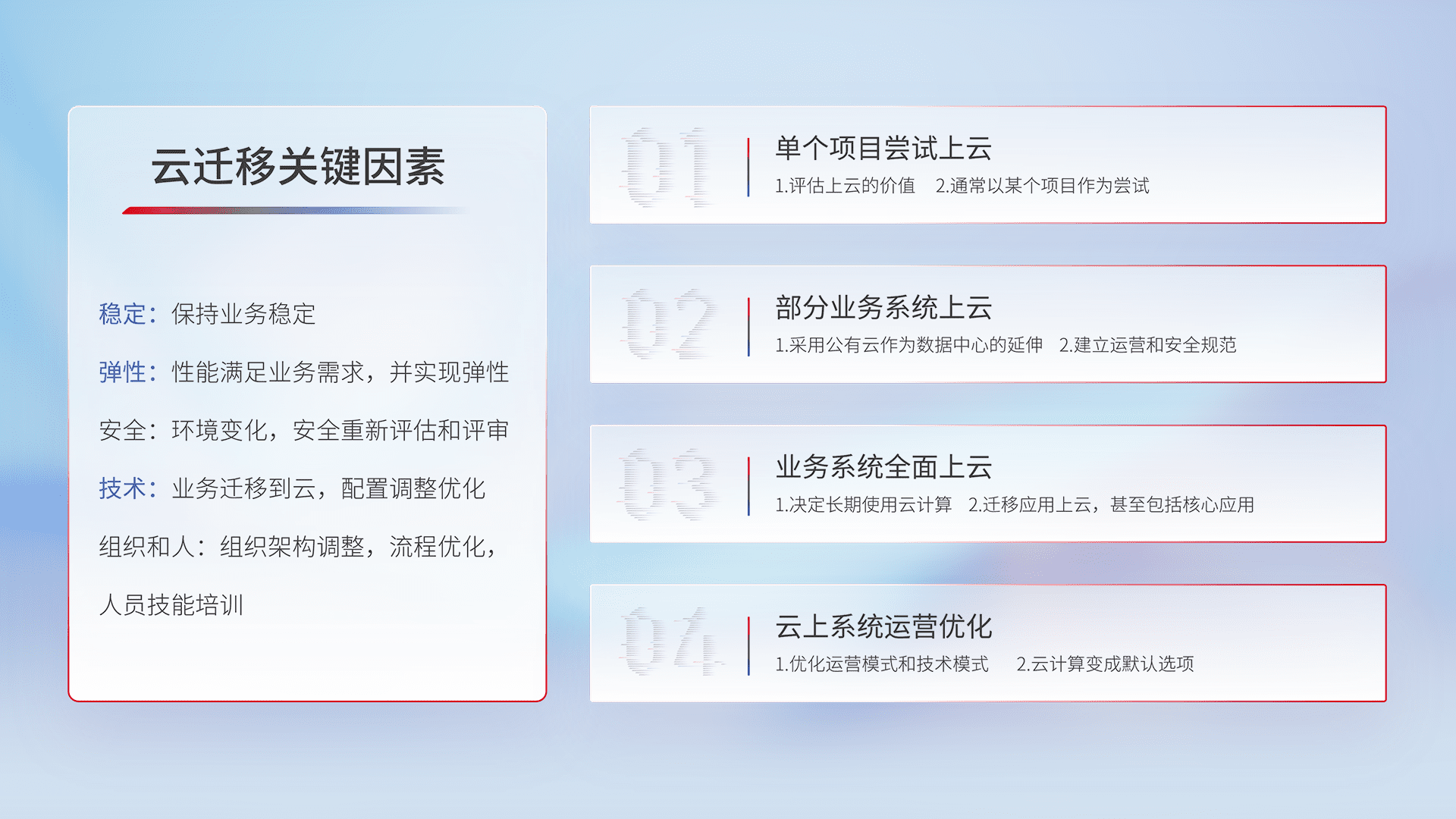 结合实际业务,,,从规划设计、、、云平台选型、、、云原生改造、、数据迁移、、、、集成交付,,,迁移全过程为客户识别最佳上云路径,,,做好风险识别管理,,,,设计网络架构、、、、身份权限、、、安全审计合规、、、、操作审计、、日志审计、、、、监控告警策略、、多站点容灾设计等,,,对云上基础设施进行整体规划,,,提升IT治理水平,,以满足弹性、、高可用、、、高性能的需求。。。。